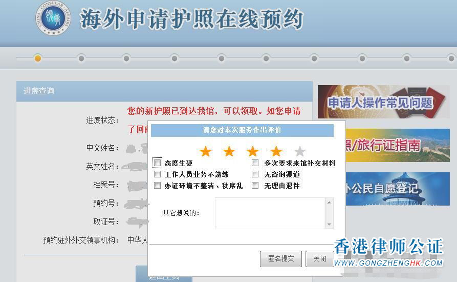 預(yù)約系統(tǒng)還增加了“收集領(lǐng)事服務(wù)評(píng)價(jià)”功能,當(dāng)預(yù)約系統(tǒng)進(jìn)度顯示“您的新護(hù)照已到達(dá)我館,可以領(lǐng)取”狀態(tài)時(shí),申請(qǐng)人即可對(duì)駐外使領(lǐng)館窗口服務(wù)、業(yè)務(wù)辦理、辦證環(huán)境等進(jìn)行在線評(píng)價(jià)。外交部領(lǐng)事司將定期收集大家對(duì)駐外使領(lǐng)館的服務(wù)評(píng)價(jià),更有針對(duì)性地改進(jìn)駐外使領(lǐng)館領(lǐng)事窗口服務(wù)工作。